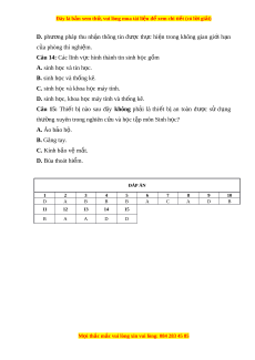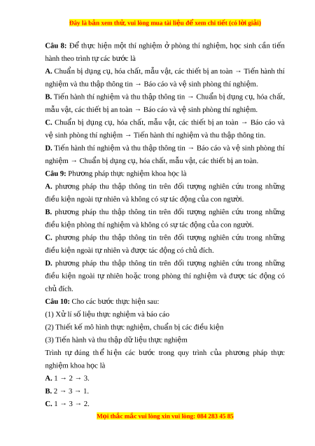 Đây là bản xem th , vu ử i lòng mua tài li u ệ đ xe ể m chi ti t ế (có l i ờ gi i ả ) Câu 8: Đ ể th c ư hi n ê m t ô thi nghi m ê ơ phòng thi nghi m ê , h c o sinh c n â ti n ê hanh theo trinh t các b ư ư c ơ la A. Chu n ẩ bi d ng u c , u hoa ch t â , m u â v t â , các thi t ê b ian toan → Ti n ê hanh thi nghiêm va thu th p
