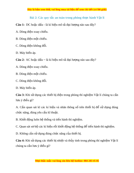 n toàn trong phòng th c hà ự nh V t ậ lí Câu 1: DC ho c ặ d u - ấ là kí hi u m ệ ô t đ ả i ạ lư ng nào s ợ au đây? A. Dòng đi n xoay chi ệ u. ề B. Dòng đi n m ệ t ộ chi u. ề C. Dòng đi n không đ ệ i ổ . D. Máy bi n áp. ế Câu 2: AC ho c d ặ u ~ ấ là kí hi u m ệ ô t đ ả i ạ lư ng ợ nào sau đây? A. Dòng đi n xoay chi ệ u. ề B. Dòng đi n m ệ t ộ chi u. ề C. Dòng đi n không đ ệ i ổ . D. Máy bi n áp. ế Câu 3: Khi sử d ng ụ các thi t ế bị đi n ệ trong phòng thí nghi m ệ V t ậ lí chúng ta c n ầ l u ý đi ư u gì ề ? A. C n