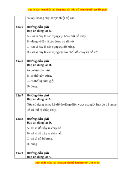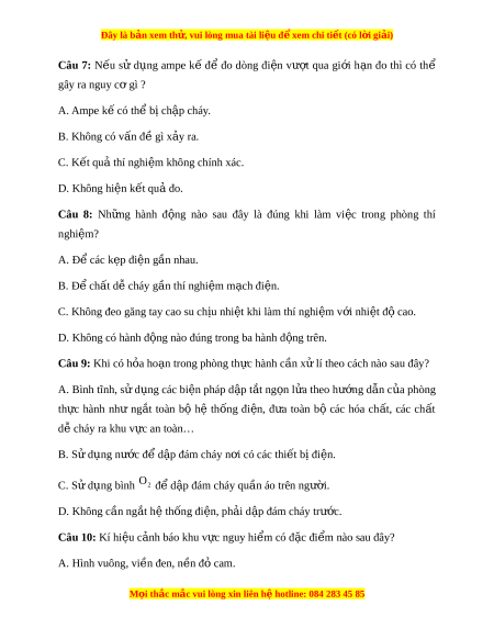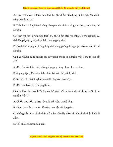 Đây là bản xem th , vu ử i lòng mua tài li u ệ đ xe ể m chi ti t (c ế ó l i ờ gi i ả ) A. Quan sát kĩ các kí hi u ệ trên thi t ế b ,ị đ c ặ đi m ể c a ủ d ng ụ c ụ thí nghi m ệ , ch c ứ năng c a ủ d ng c ụ . ụ B. Ti n ế hành thí nghi m ệ không c n ầ quan sát vì tin tư ng ở vào d ng ụ c ụ phòng thí nghiệm. C. Quan sát các kí hi u ệ trên thi t ế b ,ị đ c ặ đi m ể c a ủ các d ng ụ cụ thí nghi m ệ , có th dùng d ể ng ụ c này t ụ hay th cho d ế ng ụ c khác. ụ D. Có thể sử d ng ụ m i ọ ng ố th y