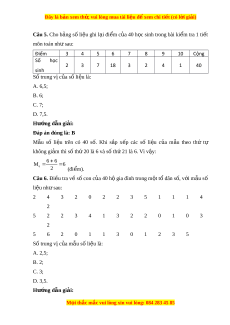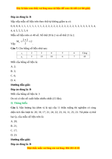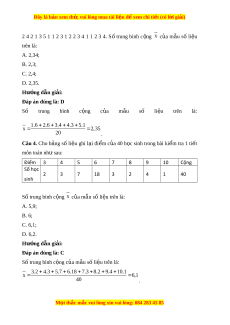 ử vui lòng mua tài li u ệ đ ể xem chi ti t ế (có l i ờ gi i ả ) Câu 5. Cho b ng ả s l ố i u ệ ghi l i ạ đi m ể c a ủ 40 h c ọ sinh trong bài ki m ể tra 1 ti t ế môn toán nh s ư au: Điểm 3 4 5 6 7 8 9 10 Cộng Số học 2 3 7 18 3 2 4 1 40 sinh Số trung v c ị a s ủ ố li u l ệ à: A. 6,5; B. 6; C. 7; D. 7,5. Hư ng ớ d n gi ẫ i ả : Đáp án đúng là: B Mẫu số li u ệ trên có 40 s . ố Khi s p ắ x p ế các số li u ệ c a ủ m u ẫ theo thứ tự không gi m ả thì số th 20 l ứ à 6 và số th 21 l ứ à 6. Vì v y: ậ 6 6 M 6 e 2 (đi m ể ). Câu 6. Đi u ề tra v ề s con ố c a ủ 40 h gi ộ a đình trong m t ộ t dân ổ s , v ố i ớ m u s ẫ ố li u nh ệ ư sau: 2 4 3 2 0 2 2 3 5 1 1 1 4 2 5 2 2 3 4 1 3 2 2 0 1 0 3 2 5 6 2 0 1 1 3 0 1 2 3 5 Số trung v c ị a m ủ ẫu số li u l ệ à: A. 2,5; B. 2; C. 3; D. 3,5. Hư ng ớ d n gi ẫ i ả : Mọi th c ắ m c