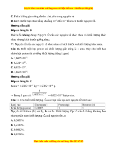 1amu = 1,6605×10-27 kg = 1,6605×10-24 g. 1 24 1,6605 1 0 Trong 1 gam có: 6,022×1023 h t ạ proton. Câu 11. Cho bi t ế khối lư ng ợ c a các ủ h t ạ c u t ấ o nên ạ nguyên t nh ử s ư au: Lo i ạ h t ạ Electron (e) Proton (p) Neutron (n) Khối lư ng ( ợ amu) 0,00055 1 1