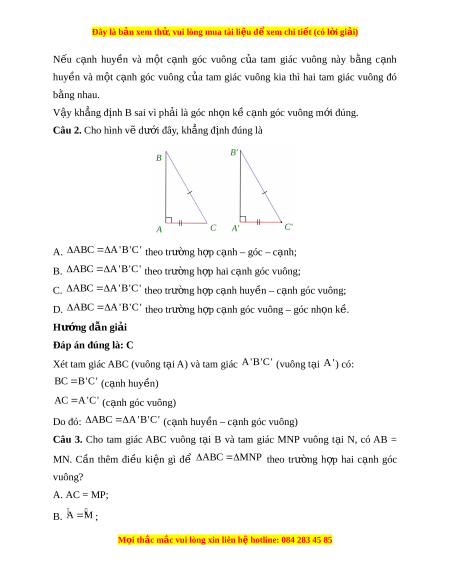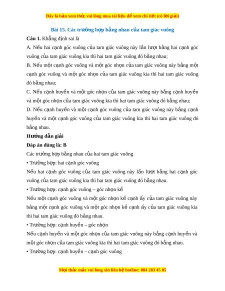 Đây là bản xem th , vu ử i lòng mua tài li u ệ đ xe ể m chi ti t (c ế ó l i ờ gi i ả ) Bài 15. Các trư ng h ờ p b ợ ng n ằ hau c a t ủ am giác vuông Câu 1. Kh ng ẳ đ nh s ị ai là A. N u ế hai c nh ạ góc vuông c a ủ tam giác vuông này l n ầ lư t ợ b ng ằ hai c nh ạ góc vuông c a