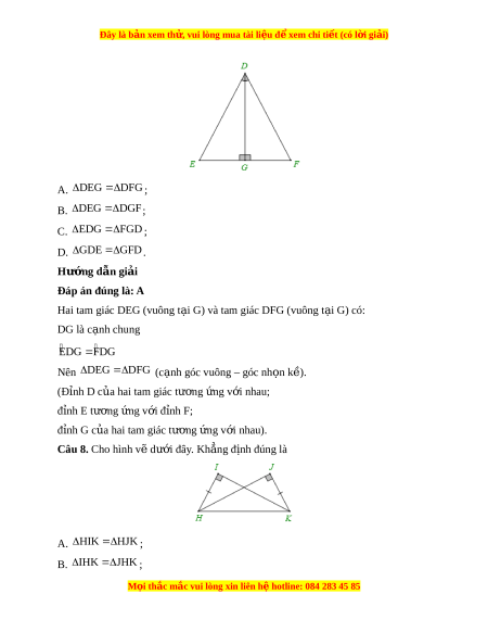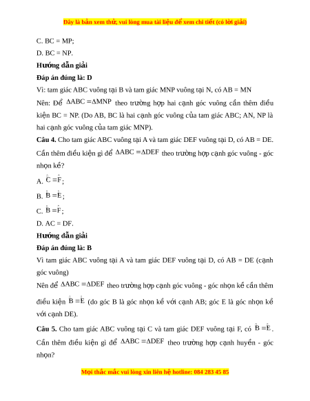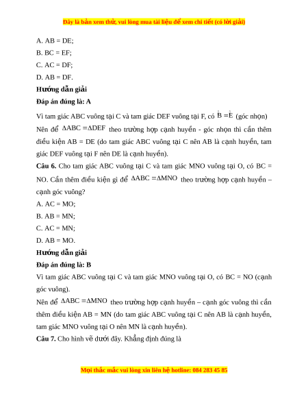 Đây là bản xem th , vu ử i lòng mua tài li u ệ đ xe ể m chi ti t (c ế ó l i ờ gi i ả ) A. AB = DE; B. BC = EF; C. AC = DF; D. AB = DF. Hư ng d ớ ẫn gi i ả Đáp án đúng là: A Vì tam giác ABC vuông t i
