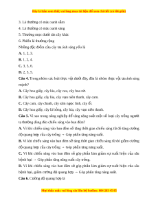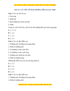 Đây là bản xem th , vu ử i lòng mua tài li u ệ đ xe ể m chi ti t (c ế ó l i ờ gi i ả ) BÀI 19: CÁC Y U Ế TỐ N Ả H HƯ N Ở G Đ N Ế QUANG H P Ợ Câu 1. Cho các y u t ế ố sau: 1. Ánh sáng 2. Nhi t ệ độ 3. Hàm lư ng ợ khí carbon dioxide 4. Nư c ớ Trong các y u t ế ố k t ể rên, y u t ế ố nào nh ả hư ng đ ở n ế quá trình quang h p ợ A. 1, 2, 3, 4. B. 1, 3, 4. C. 1, 2, 4. D. 2, 3, 4. Câu 2. Cho các đ c ặ đi m ể sau: 1. Thư ng ờ m c ọ nh ở ng n ữ i ơ quang đãng 2. Phi n l ế á thư ng ờ nhỏ 3. Lá thư ng có m ờ àu xanh s m ẫ 4. Lá thư ng có m ờ àu xanh sáng 5. Thư ng ờ m c d ọ ư i ớ tán cây khác 6. Phi n l ế á thư ng ờ r ng ộ Nh ng ữ đ c đi ặ m ể c a ủ cây a ánh ư sáng m nh ạ là A. 1, 2, 3. B. 1, 2, 4. C. 3, 5, 6. D. 2, 3, 5. Câu 3. Cho các đ c ặ đi m ể sau: 1. Thư ng ờ m c ọ nh ở ng n ữ i ơ quang đãng 2. Phi n l ế á thư ng ờ nhỏ M i