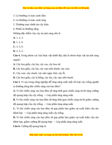 Đây là bản xem th , vu ử i lòng mua tài li u ệ đ xe ể m chi ti t (c ế ó l i ờ gi i ả ) 3. Lá thư ng có m ờ àu xanh s m ẫ 4. Lá thư ng có m ờ àu xanh sáng 5. Thư ng ờ m c d ọ ư i ớ tán cây khác 6. Phi n l ế á thư ng ờ r ng ộ Nh ng ữ đ c đi ặ m ể c a ủ cây a ánh ư sáng y u l ế à A. 1, 2, 3. B. 1, 2, 4. C. 3, 5, 6. D. 2, 3, 5.