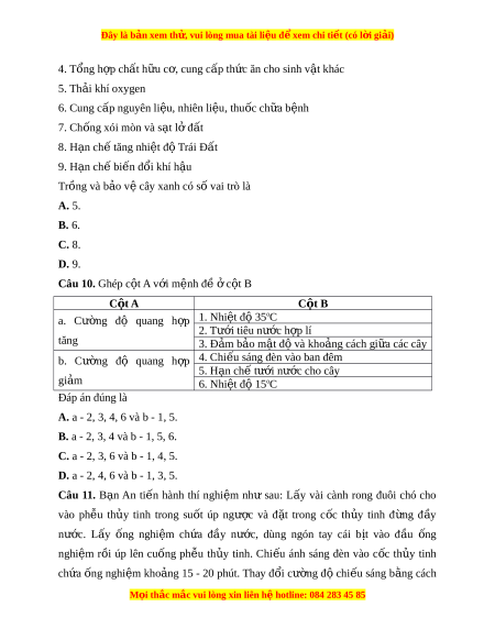 ả vệ cây xanh có số vai trò là A. 5. B. 6. C. 8. D. 9. Câu 10. Ghép c t ộ A v i ớ m nh đ ệ ề c ở t ộ B C t ộ A C t ộ B a. Cư ng ờ độ quang h p ợ 1. Nhi t ệ đ 35 ộ oC 2. Tư i ớ tiêu nư c ớ h p l ợ í tăng 3. Đ m ả b o ả m t ậ đ và ộ kho ng cách ả gi a ữ các cây b. Cư ng ờ độ quang h p ợ 4. Chi u s ế áng đèn vào ban đêm 5. H n ch ạ ế tư i ớ nư c ớ cho cây gi m ả 6. Nhi t ệ đ 15 ộ oC Đáp án đúng là