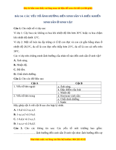 ơ 25oC, đa số là con cái n u ế trên 30oC. Các ví d t ụ rên ch ng m ứ inh nh h ả ư ng ở c a nhân ủ t nào đ ố n s ế inh s n ả s ở inh v t ậ ? A. Ánh sáng. B. Nhi t ệ độ. C. Độ m ẩ . D. Chất dinh dư ng ỡ . Câu 2. Cho các d l ữ i u s ệ au: C t ộ A C t ộ B 1. Y u t ế ố bên ngoài a. Ánh sáng b. Đ c ặ đi m ể c a ủ loài c. Nhiệt độ 2. Y u t ế ố bên trong d. Hormone sinh s n ả e. Chất dinh dư ng ỡ f. Nư c ớ Hãy ghép c t ộ A v i ớ c t ộ B sao cho h p ợ lý nh t ấ . A. 1-b,d và 2-a,c,e,f. B. 1-a,c,e,f và 2-b,d. C. 1-b,d,e và 2-a,c,f. D. 1-a,c,e và 2-b,d,f.