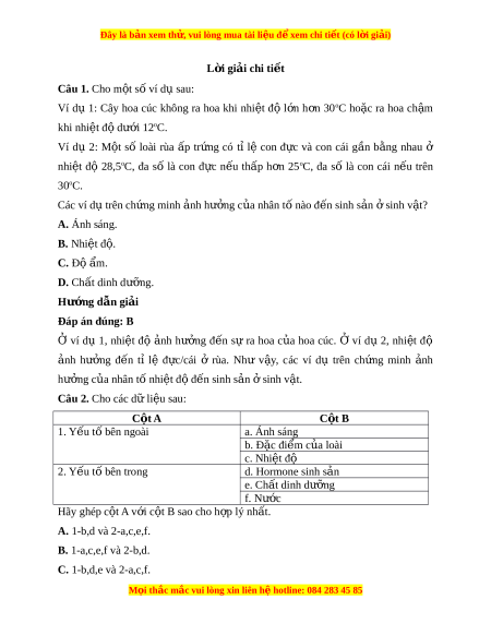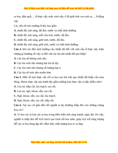 Đây là bản xem th , vu ử i lòng mua tài li u ệ đ xe ể m chi ti t (c ế ó l i ờ gi i ả ) ra hoa, đ u ậ qu ,… ả ở th c ự v t ậ ; m c s ứ inh s n, ả t ỉl gi ệ i ớ tính con sinh ra,… ở đ ng ộ v t ậ . Các y u t ế ố môi trư ng ờ đây bao g ở m ồ A. nhiệt đ , ánh s ộ áng, đ ộ m ẩ , nư c ớ và ch t ấ dinh dư ng. ỡ B. nhi t ệ đ , ộ ánh sáng, tu i ổ c a ủ loài, nư c, đ ớ ộ m ẩ . C. nhiệt đ , ánh s ộ áng, gi i ớ tính, nư c, ớ đ ộ m ẩ . D. nhiệt đ , ánh s ộ áng, gi i ớ tính, nư c ớ và ch t ấ dinh dư ng. ỡ Câu 4. Khi nói đ n ế nh ả hư ng ở c a ủ nhi t ệ độ đ i ố v i ớ sinh s n ả ở th c ự v t ậ , hi n ệ tư ng ợ gì thư ng s ờ ẽ x y ả ra đối v i ớ cây lúa khi nhi t ệ đ quá t ộ h p? ấ