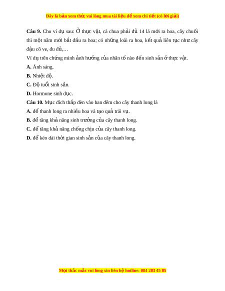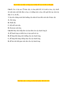 Câu 9. Cho ví dụ sau: Ở th c ự v t ậ , cà chua ph i ả đủ 14 lá m i ớ ra hoa, cây chu i ố thì m t ộ năm m i ớ b t ắ đ u ầ ra hoa; có nh ng ữ loài ra hoa, k t ế qu ả liên t c ụ nh ư cây đ u ậ cô ve, đu đ ,… ủ Ví d t ụ rên ch ng m ứ inh nh ả hư ng c ở a ủ nhân t nào ố đ n s ế inh s n ả t ở h c ự v t ậ . A. Ánh sáng. B. Nhi t ệ đ . ộ