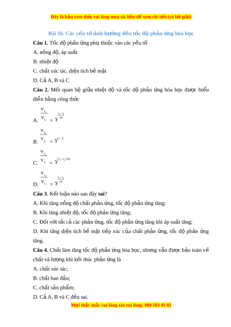 Đây là bản xem th , vu ử i lòng mua tài li u ệ đ xe ể m chi ti t ế (có l i ờ gi i ả ) Bài 16. Các y u t ế ố nh h ả ư ng đ ở n t ế c đ ố ph ộ n ả ng hóa h ứ c ọ Câu 1. Tốc đ ph ộ n ả ng ph ứ t ụ hu c ộ vào các y u t ế ố A. nồng đ , ộ áp suất B. nhiệt độ C. chất xúc tác, di n t ệ ích b m ề t ặ D. Cả A, B và C