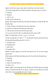 ợ sau: Tàn đóm đỏ bùng lên khi cho vào bình oxygen nguyên chất. Hiện tư ng t ợ rên th hi ể n ệ nh h ả ư ng ở c a y ủ u ế t nào đ ố n t ế c đ ố ph ộ n ả ng? ứ A. Nồng đ ; ộ B. Nhi t ệ đ ; ộ C. Di n t ệ ích b m ề t ặ ti p xúc; ế D. Chất xúc tác. Câu 9. Ngư i ờ ta v n ậ d ng ụ y u ế tố nào để tăng t c ố đ ộ ph n ả ng ứ trong trư ng ờ h p ợ sau: Nung h n ỗ h p ợ b t ộ đá vôi, đ t ấ sét và th ch ạ cao ở nhi t ệ đ ộ cao đ ể s n ả