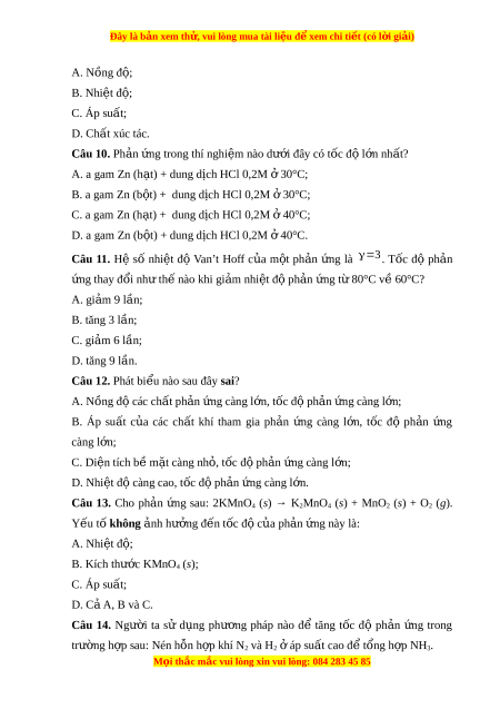 Đây là bản xem th , vu ử i lòng mua tài li u ệ đ xe ể m chi ti t ế (có l i ờ gi i ả ) A. Nồng đ ; ộ B. Nhi t ệ đ ; ộ C. Áp suất; D. Chất xúc tác. Câu 10. Ph n ả ng t ứ rong thí nghi m ệ nào dư i ớ đây có t c đ ố l ộ n nh ớ t ấ ? A. a gam Zn (h t ạ ) + dung d ch H ị Cl 0,2M 30°C ở ; B. a gam Zn (b t ộ ) + dung d ch H ị Cl 0,2M 30°C ở ; C. a gam Zn (h t ạ ) + dung d ch H ị Cl 0,2M 40°C ở ; D. a gam Zn (b t ộ ) + dung d ch H ị Cl 0,2M 40°C ở .