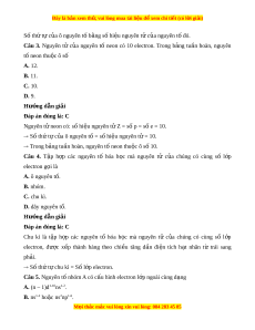 ủ nguyên tố neon có 10 electron. Trong b ng ả tu n ầ hoàn, nguyên tố neon thu c ô s ộ ố A. 12. B. 11. C. 10. D. 9. Hư ng d ớ ẫn gi i ả Đáp án đúng là: C Nguyên t neon có: ử s hi ố u nguyên t ệ Z ử = số p = s e = 10. ố Số th t ứ c ự a ủ ô nguyên tố = s hi ố u nguyên t ệ = 10. ử Trong b ng t ả u n hoàn, nguyên t ầ ố neon thu c ộ ô s 10. ố Câu 4. T p ậ h p ợ các nguyên tố hóa h c ọ mà nguyên tử c a ủ chúng có cùng số l p ớ electron g i ọ là A. ô nguyên tố. B. nhóm. C. chu kì. D. dãy nguyên tố. Hư ng d ớ ẫn gi i ả Đáp án đúng là: C Chu kì là t p ậ h p ợ các nguyên tố hóa h c ọ mà nguyên tử c a ủ chúng có cùng số l p ớ electron, đư c ợ x p ế thành hàng theo chi u ề tăng d n ầ đi n ệ tích h t ạ nhân từ trái sang ph i ả . Số th t ứ chu ự kì = S l ố p el ớ ectron.