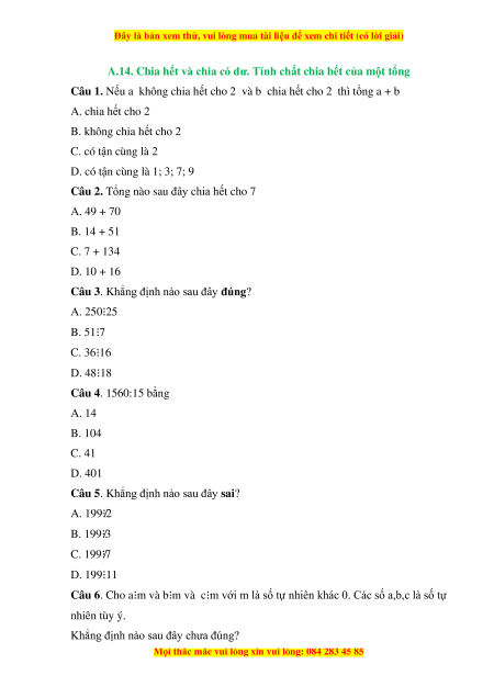 A.14. Chia hết và chia có dư. Tính chất chia hết của một tổng