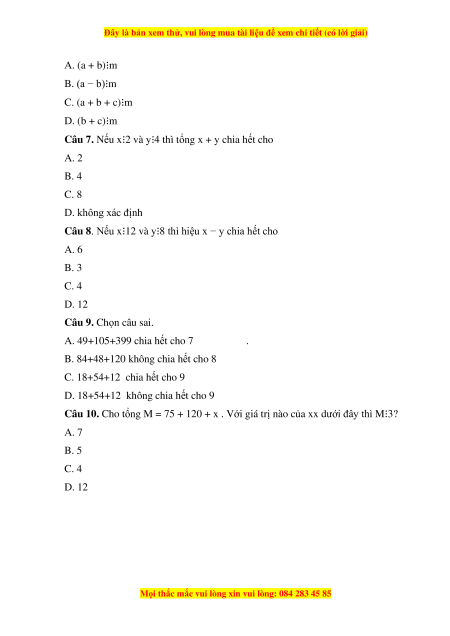 Câu 10. Cho tổng M = 75 + 120 + x . Với giá trị nào của xx dưới đây thì M⋮3? A. 7 B. 5 C. 4 D. 12