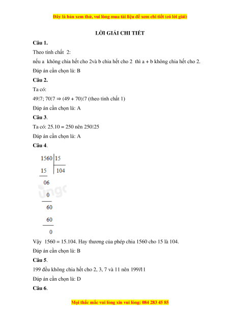 Câu 3. Khẳng định nào sau đây đúng? A. 250⋮25 B. 51⋮7 C. 36⋮16 D. 48⋮18 Câu 4. 1560:15 bằng A. 14 B. 104 C. 41 D. 401