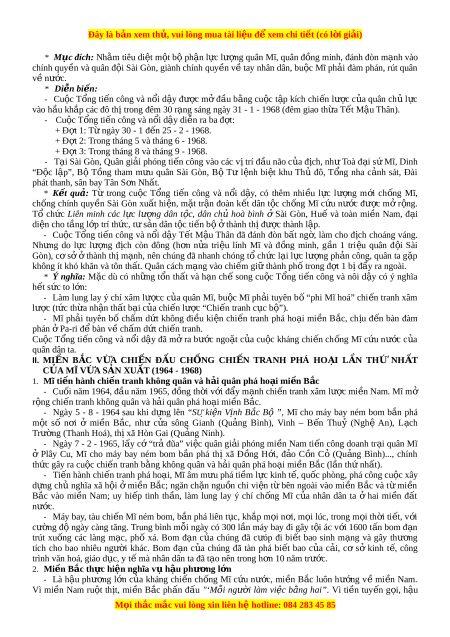 ả phóng có cơ quan thư ng ờ tr c ự ở h u ầ h t ế các nư c ớ xã h i ộ chủ nghĩa và ở m t ộ số nư c ớ thu c ộ thế gi i ớ thứ ba. Cư ng ơ lĩnh c a ủ M t ặ tr n ậ đư c ợ 41 nư c ớ , 12 tổ ch c ứ qu c ố tế, 5 tổ ch c ứ khu v c ự lên tiếng ng ủ h . ộ 3. Cu c ộ Tổng ti n ế công và n i ổ d y ậ T t M ế u ậ Thân (1968) * Hoàn cảnh: - Bư c ớ vào mùa xuân 1968, xu t ấ phát t nh ừ n ậ đ nh ị so sánh l c ự lư ng ợ thay đ i ổ có l i ợ cho ta sau hai mùa khô. - Năm 1968, ta l i ợ d ng ụ mâu thu n ẫ ở Mĩ trong năm b u ầ c T ử ng ổ th ng ố (1968), ta ch ủ trư ng ơ mở m t ộ cu c ộ T ng ổ ti n ế công và n i ổ dậy trên toàn mi n N ề am, tr ng ọ tâm là đô th .ị M i