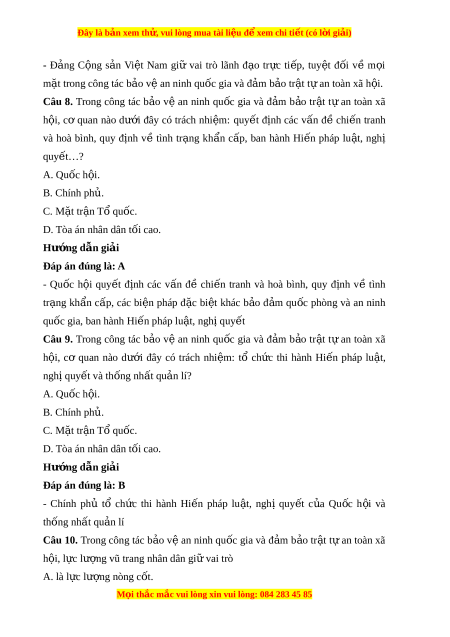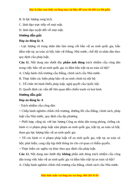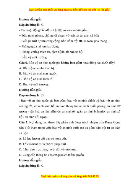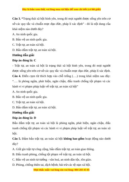 Đây là bản xem th , vu ử i lòng mua tài li u ệ đ xe ể m chi ti t (c ế ó l i ờ gi i ả ) Câu 3. “Tr ng t ạ hái xã h i ộ bình yên, trong đó m i ọ ngư i ờ đư c s ợ ng ố yên trên cơ sở các quy t c ắ và chu n ẩ m c ự đ o ạ đ c, ứ pháp lí xác đ nh” ị - đó là n i ộ dung c a ủ khái ni m ệ nào dư i ớ đây? A. An ninh quốc gia. B. B o ả v an ệ ninh qu c gi ố a. C. Tr t ậ t , an t ự oàn xã h i ộ . D. B o đ ả m ả tr t ậ t , an t ự oàn xã h i ộ . Hư ng d ớ ẫn gi i ả Đáp án đúng là: C - Tr t ậ t , ự an toàn xã h i ộ là tr ng ạ thái xã h i ộ bình yên, trong đó m i ọ ngư i ờ đư c ợ sống yên trên c s ơ các ở quy t c và chu ắ n m ẩ c đ ự o ạ đ c, pháp l ứ í xác đ nh. ị Câu 4. Đi n ề c m ụ từ thích h p ợ vào chỗ tr ng ố (….) trong khái ni m ệ sau đây: “…. là phòng ng a, ừ phát hi n, ệ ngăn ch n, ặ đ u ấ tranh ch ng ố t i ộ ph m ạ và các hành vi vi ph m ạ pháp lu t ậ v t ề r t ậ t , an ự toàn xã h i ộ ” A. An ninh quốc gia. B. B o ả v an ệ ninh qu c gi ố a. C. Tr t ậ t , an t ự oàn xã h i ộ . D. B o đ ả m ả tr t ậ t , an t ự oàn xã h i ộ . Hư ng d ớ ẫn gi i ả Đáp án đúng là: D B o ả đ m ả tr t ậ t , ự an toàn xã h i ộ là phòng ng a, ừ phát hi n, ệ ngăn ch n, ặ đ u ấ tranh ch ng ố t i ộ ph m ạ và các hành vi vi ph m ạ pháp lu t ậ về tr t ậ t , ự an toàn xã h i ộ . Câu 5. Đ m ả b o ả tr t ậ t , ự an toàn xã h i ộ không bao g m ồ ho t ạ đ ng ộ nào dư i ớ đây? A. Giữ gìn tr t ậ t công ự c ng, b ộ o ả đ m ả tr t ậ t , an t ự oàn giao thông.