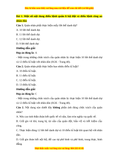 Câu 1. Quân nhân ph i ả th c hi ự n m ệ ấy l i ờ th danh ề d ? ự A. 10 l i ờ th danh d ề . ự B. 11 l i ờ th danh ề d . ự C. 12 l i ờ th danh ề d . ự D. 9 l i ờ th danh d ề . ự Hư ng ớ d n gi ẫ i ả Đáp án đúng là: A - M t ộ trong nh ng ữ ch c ứ trách c a ủ quân nhân là: th c ự hi n ệ 10 l i ờ th ề danh dự và 12 đi u k ề ỉ lu t ậ v i