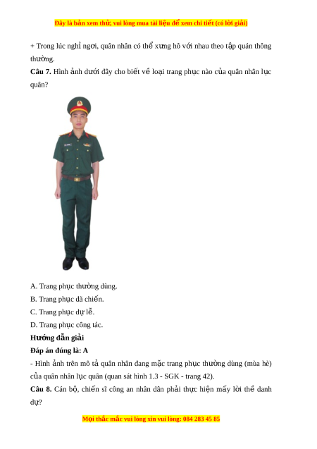 Đây là bản xem th , vu ử i lòng mua tài li u ệ đ xe ể m chi ti t (c ế ó l i ờ gi i ả ) + Trong lúc nghỉ ng i ơ , quân nhân có th ể x ng ư hô v i ớ nhau theo t p ậ quán thông thư ng. ờ Câu 7. Hình nh ả dư i ớ đây cho bi t ế v ề lo i ạ trang ph c ụ nào c a ủ quân nhân l c ụ quân? A. Trang ph c ụ thư ng ờ dùng. B. Trang ph c dã chi ụ n. ế C. Trang ph c d ụ l ự . ễ D. Trang ph c ụ công tác. Hư ng d ớ ẫn gi i ả Đáp án đúng là: A - Hình nh