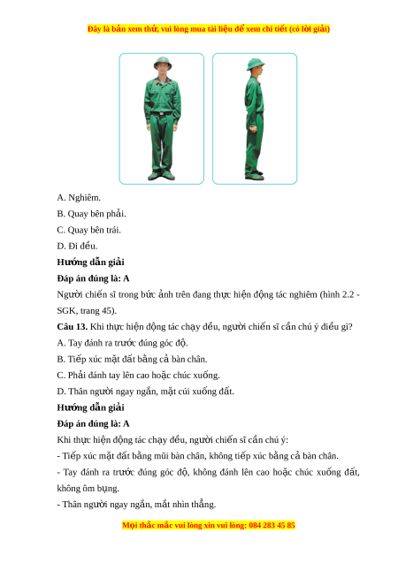 Câu 11. Khẩu l nh “Đ ệ ng d ứ y”, ậ A. có d l ự nh và ệ đ ng l ộ nh. ệ B. ch có d ỉ l ự nh, không có đ ệ ng l ộ nh. ệ C. ch có đ ỉ ng l ộ nh, không có d ệ l ự nh. ệ D. không có c d ả l ự nh và đ ệ ng ộ l nh. ệ Hư ng d ớ ẫn gi i ả Đáp án đúng là: C Khẩu l nh “Đ ệ ng d ứ y”, ậ ch có đ ỉ ng l ộ nh, không có d ệ l ự nh. ệ Câu 12. Ngư i ờ chi n s ế ĩ trong b c ứ nh ả dư i ớ đây đang th c ự hi n đ ệ ng ộ tác nào? M i ọ thắc m c