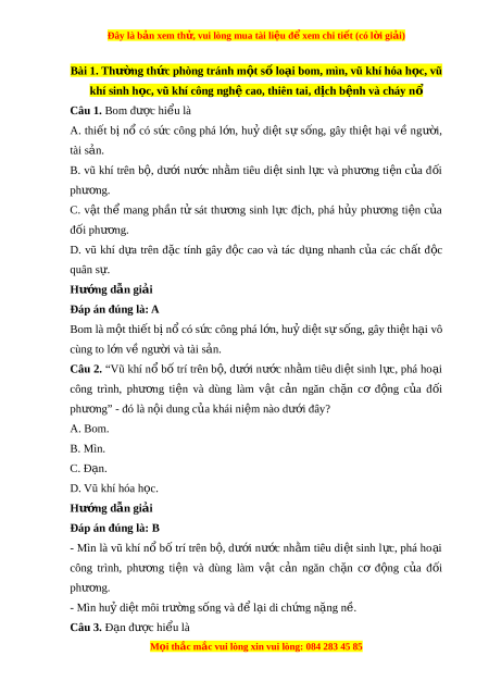 ạ bom, mìn, vũ khí hóa h c, ọ vũ khí sinh h c, vũ khí ọ công ngh cao, t ệ hiên tai, d ch b ị nh và cháy n ệ ổ Câu 1. Bom đư c ợ hi u l ể à A. thi t ế bị nổ có s c ứ công phá l n, ớ huỷ di t ệ s ự s ng, ố gây thi t ệ h i ạ v ề ngư i ờ , tài s n. ả B. vũ khí trên b , ộ dư i ớ nư c ớ nh m ằ tiêu di t ệ sinh l c ự và phư ng ơ ti n ệ c a ủ đ i ố phư ng. ơ C. v t ậ thể mang ph n ầ tử sát thư ng ơ sinh l c ự đ ch, ị phá h y ủ phư ng ơ ti n ệ c a ủ đối phư ng. ơ D. vũ khí d a ự trên đ c ặ tính gây đ c ộ cao và tác d ng ụ nhanh c a ủ các ch t ấ đ c ộ quân s . ự Hư ng ớ d n gi ẫ i ả Đáp án đúng là: A Bom là m t ộ thi t ế b n ị có s ổ c ứ công phá l n, hu ớ di ỷ t ệ sự s ng, gây t ố hi t ệ h i ạ vô cùng to l n v ớ ng ề ư i ờ và tài s n. ả