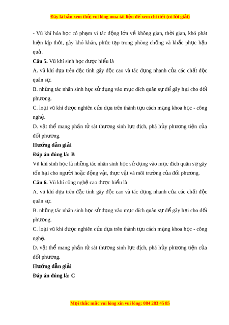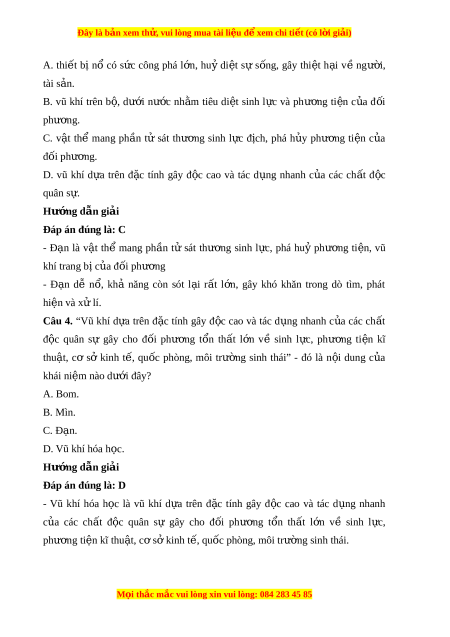 Đây là bản xem th , vu ử i lòng mua tài li u ệ đ xe ể m chi ti t (c ế ó l i ờ gi i ả ) A. thi t ế bị nổ có s c ứ công phá l n, ớ huỷ di t ệ sự s ng, ố gây thi t ệ h i ạ v ề ngư i ờ , tài s n. ả B. vũ khí trên b , ộ dư i ớ nư c ớ nh m ằ tiêu di t ệ sinh l c ự và phư ng ơ ti n ệ c a ủ đ i ố phư ng. ơ C. v t ậ thể mang ph n ầ tử sát thư ng ơ sinh l c ự đ ch, ị phá h y ủ phư ng ơ ti n ệ c a ủ đối phư ng. ơ D. vũ khí d a ự trên đ c ặ tính gây đ c ộ cao và tác d ng ụ nhanh c a ủ các ch t ấ đ c ộ quân s . ự Hư ng d ớ ẫn gi i ả Đáp án đúng là: C - Đ n ạ là v t ậ thể mang ph n ầ tử sát thư ng ơ sinh l c, ự phá huỷ phư ng ơ ti n, ệ vũ khí trang b c ị a đ ủ ối phư ng ơ - Đ n ạ dễ n , ổ khả năng còn sót l i ạ r t ấ l n,