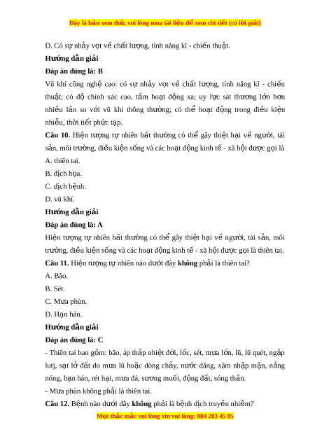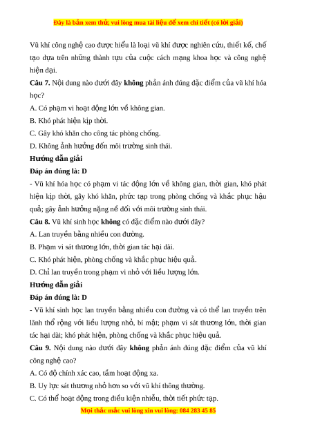 ạ dài; khó phát hi n, phòng ch ệ ng và kh ố c ph ắ c ụ hi u qu ệ . ả Câu 9. N i ộ dung nào dư i ớ đây không ph n ả ánh đúng đ c ặ đi m ể c a ủ vũ khí công nghệ cao? A. Có đ chí ộ nh xác cao, t m ầ ho t ạ đ ng xa. ộ B. Uy l c s ự át thư ng nh ơ h ỏ n s ơ o v i ớ vũ khí thông thư ng. ờ C. Có th ho ể t ạ đ ng t ộ rong đi u ki ề n nhi ệ u, t ễ h i ờ ti t ế ph c ứ t p. ạ M i ọ thắc m c