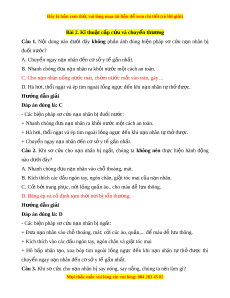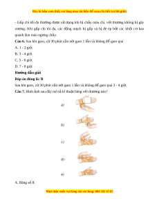 ớ mát vào trán, gáy, nách, b n ẹ + Sau khi sơ c u, chuy ứ n ể ngay n n nhân đ ạ n ế c s ơ y t ở g ế n nh ầ t ấ . Câu 4. Không s d ử ng kĩ ụ thu t ậ băng ép khi n n nhân b ạ l ị oài r n nào c ắ n? ắ A. R n c ắ p ạ nong. B. R n ắ h m ổ ang chúa. C. R n ắ bi n. ể D. R n l ắ c. ụ Hư ng d ớ ẫn gi i ả Đáp án đúng là: D - Không băng ép khi b r ị n l ắ c c ụ n ắ vì có th l ể àm v t ế thư ng ơ n ng t ặ hêm. Câu 5. Kĩ thu t ậ g p chi ấ tối đa thư ng đ ờ ược sử d ng t ụ rong trư ng h ờ p ợ nào? A. Bị ch y m ả áu ở chi, v t ế thư ng không b ơ gãy x ị ư ng. ơ B. Bị ch y ả máu chi ở , v t ế thư ng b ơ gãy x ị ư ng. ơ C. Khi b ch ị y m ả áu nhi u, m ề áu ph t ụ thành tia. D. Khi ch y m ả áu ít, máu ph t ụ thành tia. Hư ng d ớ ẫn gi i ả Đáp án đúng là: A M i ọ thắc m c