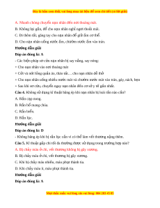 Đây là bản xem th , vu ử i lòng mua tài li u ệ đ xe ể m chi ti t (c ế ó l i ờ gi i ả ) Bài 2. Kĩ thu t ậ c p c ấ u và chuy ứ n t ể hư ng ơ Câu 1. N i ộ dung nào dư i ớ đây không ph n ả ánh đúng bi n ệ pháp sơ c u ứ n n ạ nhân bị đuối nư c? ớ A. Chuy n ể ngay n n ạ nhân đ n c ế s ơ y t ở g ế n nh ầ t ấ . B. Nhanh chóng đ a n ư n ạ nhân ra kh i ỏ nư c ớ m t ộ cách an toàn. C. Cho n n ạ nhân u ng n ố ước mát, ch m ờ nư c ớ m t ắ vào trán, gáy… D. Hà h i ơ , th i ổ ng t ạ và ép tim ngoài l ng ng ồ c ự đ n khi ế n n nhân ạ t t ự h đ ở ư c. ợ Hư ng d ớ ẫn gi i ả Đáp án đúng là: C - Các bi n pháp ệ s c ơ u ứ n n nhân b ạ đu ị i ố nư c: ớ + Nhanh chóng đ a n ư n nhân ạ ra kh i ỏ nư c m ớ t ộ cách an toàn. + Hà h i ơ , th i ổ ng t ạ và ép tim ngoài l ng ng ồ c ự đ n khi ế n n nhân t ạ t ự h đ ở ư c. ợ + Chuy n ể ngay n n nhân ạ đ n c ế s ơ ở y t g ế n nh ầ t ấ . Câu 2. Khi sơ c u ứ cho n n ạ nhân bị ng t