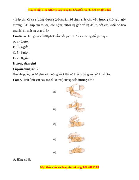 Câu 6. Sau khi garo, c 30 phút ứ c n n ầ i ớ garo 1 l n và không đ ầ gar ể o quá A. 1 - 2 gi . ờ B. 3 - 4 gi . ờ C. 5 - 6 gi . ờ D. 7 - 8 gi . ờ Hư ng d ớ ẫn gi i ả Đáp án đúng là: B Sau khi garo, c 30 phút ứ c n n ầ i ớ garo 1 l n và không đ ầ gar ể o quá 3 - 4 gi . ờ Câu 7. Hình nh ả sau đây mô t kĩ ả thu t ậ băng v t ế thư ng ơ nào? A. Băng số 8. M i ọ thắc m c