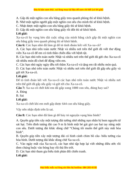 Câu 7: Xa-xa-cô chết khi em đã gấp xong 1000 con sếu, đúng hay sai? A. Đúng B. Sai Lời giải: