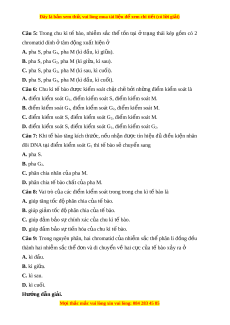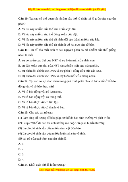 Đây là bản xem th , vu ử i lòng mua tài li u ệ đ xe ể m chi ti t ế (có l i ờ gi i ả ) Câu 10: T i ạ sao co th ể quan sát nhi m ê s c ắ th ể ro nh t â t i ạ kì gi a ư c a u nguyên phân? A. Vì lúc này nhi m ê s c ắ th dan xo ể n c ắ c ư đ i ạ . B. Vì lúc này nhi m ê s c t ắ h đong xo ể n ắ c c đ ư i ạ . C. Vì lúc này nhi m ê s c ắ th đa nhân đôi ể t o t ạ hành nhi m ê s c ắ kep. D. Vì lúc này nhi m ê s c ắ th đa phân l ể i v hai ê c c ư c a t u bào. ế