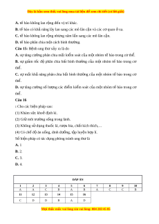 ả năng lây lan sang các mô lân c n â và các c quan ơ xa. ơ C. t bào ế không lan r ng nh ộ ng ư xâm l n s â ang các mô lân c n. â D. t bào ế phân chia m t ộ cách bình thư ng. ờ Câu 15: Bênh ung th x ư y ả ra là do A. sư tăng cư ng ờ phân chia mât ki m ể soát c a u m t ộ nhom t bào t ế rong cơ th . ể B. sư gi m ả t c ố đ ộ phân chia b t â bình thư ng ờ c a u m t ộ nhom tế bào trong cơ th . ể C. s ư m t â kh ả năng phân chia b t â bình thư ng ờ c a u m t ộ nhom t ế bào trong cơ th . ể D. s ư tăng cư ng ờ s ố lư ng ơ các đi m ể ki m ể soát c a u m t ộ nhom tế bào trong cơ th . ể Câu 16 : Cho các bi n pháp ê sau: (1) Khám s c kho ứ đ ẻ nh kì ị . (2) Giư môi trư ng s ờ ng ố trong lành. (3) Không s d ư ng t u hu c l ố á, rư u bi ơ a, ch t â kich thich,… (4) Co ch đ ế ăn ộ u ng, di ố nh dư ng, ỡ t p l â uy n h ê p l ơ i. Số bi n pháp co t ê ác d ng phòng t u ránh ung th l ư à A. 1 B. 2. C. 3. D. 4. ĐÁP ÁN 1 2 3 4 5 6 7 8 9 10 A A C B A B A C C B 11 12 13 14 15 16 C D D B A D M i ọ thắc m c