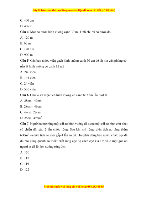 Câu 4. Một hồ nước hình vuông cạnh 30 m. Tính chu vi hồ nước đó. A. 120 m B. 60 m C. 120 dm D. 900 m