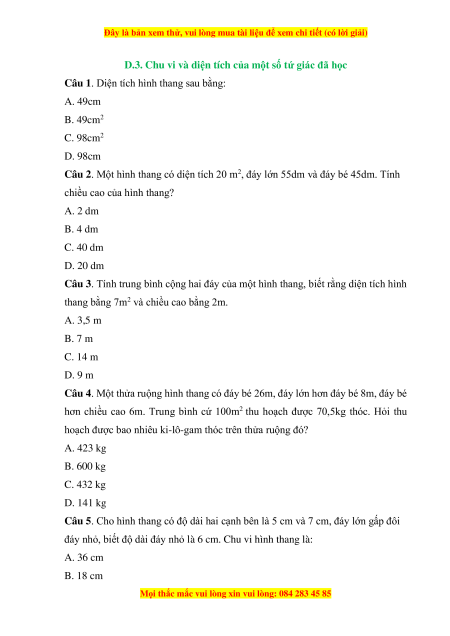 Câu 1. Diện tích hình thang sau bằng: A. 49cm B. 49cm2 C. 98cm2 D. 98cm