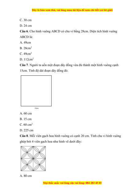Câu 6. Cho hình vuông ABCD có chu vi bằng 28cm. Diện tích hình vuông