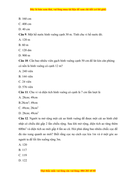 Câu 9. Một hồ nước hình vuông cạnh 30 m. Tính chu vi hồ nước đó. A. 120 m B. 60 m C. 120 dm D. 900 m