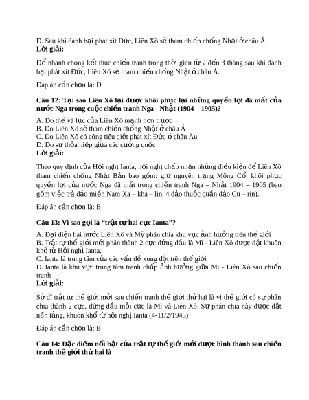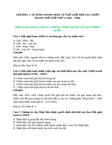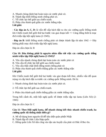 Đầu năm 1945, nguyên thủ ba cư ng ờ qu c ố M , ỹ Anh, Liên Xô đã quy t ế đ nh ị tri u ệ t p ậ h i ộ ngh c ị p cao ba n ấ ư c ớ t i ạ Ianta (Liên Xô). Đáp án c n ch ầ n l ọ à: B Câu 2: H i ộ ngh ị Ianta đư c ợ tri u t ệ p ậ vào th i ờ đi m ể nào c a cu ủ c ộ Chi n t ế ranh th gi ế i ớ th hai ứ (1939 – 1945)? A. Chi n ế tranh thế gi i ớ th hai ứ bùng nổ B. Chi n t ế ranh th gi ế i ớ th hai ứ bư c ớ vào giai đo n ạ ác li t ệ C. Chi n t ế ranh th gi ế i ớ th hai ứ bư c ớ vào giai đo n ạ k t ế thúc. D. Chi n ế tranh thế gi i ớ th hai ứ đã k t ế thúc L i ờ giải: Đầu năm 1945, cu c ộ Chi n ế tranh thế gi i ớ thứ hai bư c ớ vào giai đo n ạ k t ế thúc, nhi u ề vấn đề quan tr ng ọ và c p ấ bách đ t ặ ra cho các cư ng ờ qu c ố đ ng ồ minh => H i ộ nghị Ianta đư c t ợ ri u t ệ p ậ (4 – 11/2/1945). Đáp án c n ch ầ n l ọ à: C Câu 3: Tư ng ơ lai c a ủ Nh t ậ B n ả đư c ợ quy t ế đ n