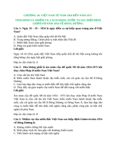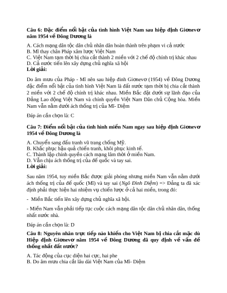 ớ 2 chế độ chính trị khác nhau. Mi n ề B c ắ đ t ặ dư i ớ sự lãnh đ o ạ c a ủ Đ ng ả Lao đ ng ộ Vi t ệ Nam và chính quy n ề Vi t ệ Nam Dân chủ C ng ộ hòa. Mi n ề Nam vẫn n m ằ dư i ớ ách th ng t ố r c ị a ủ Mĩ- Di m ệ Đáp án c n ch ầ n l ọ à: C Câu 7: Đi m ể n i ổ b t ậ c a ủ tình hình mi n ề Nam ngay sau hi p ệ đ n ị h Gi nev ơ ơ 1954 v Đ ề ông Dư ng l ơ à A. Chuy n ể sang đ u t ấ ranh vũ trang ch ng M ố . ỹ B. Kh c ắ ph c h ụ u qu ậ ả chi n t ế ranh, khôi ph c ki ụ nh t . ế C. Thành l p ậ chính quy n cách ề m ng l ạ âm th i ờ m ở i n N ề am.