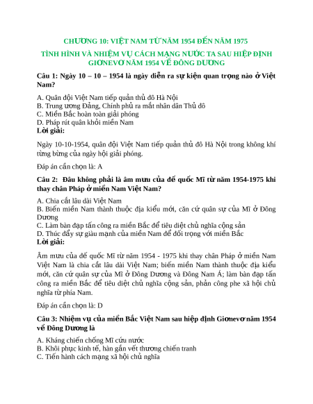 Câu 1: Ngày 10 – 10 – 1954 là ngày di n ra s ki n quan tr ng nào Vi tễ ự ệ ọ ở ệ