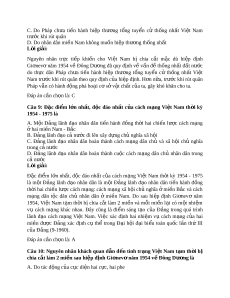 ớ khi rút quân theo quy đ nh c ị a hi ủ p đ ệ nh. H ị n n ơ a, ữ trư c ớ khi rút quân Pháp vẫn có hành đ ng ộ phá ho i ạ cơ s v ở t ậ ch t ấ c a t ủ a, gây khó khăn cho ta. Đáp án c n ch ầ n l ọ à: C Câu 9: Đ c ặ đi m ể l n ớ nh t ấ , đ c ộ đáo nh t ấ c a ủ cách m ng ạ Vi t ệ Nam th i ờ kỳ 1954 - 1975 là A. M t ộ Đ ng ả lãnh đ o ạ nhân dân ti n ế hành đ ng ồ th i ờ hai chi n ế lư c ợ cách m ng ạ ở hai mi n ề Nam - B c ắ B. Đ ng l ả ãnh đ o ạ cả nư c đi ớ lên xây d ng ự ch nghĩ ủ a xã h i ộ C. Đ ng ả lãnh đ o