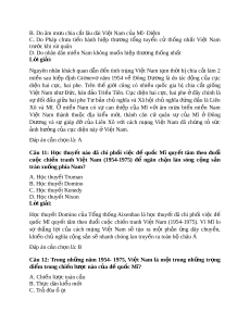 C. Đấu tranh đòi Mỹ rút quân về nư c. ớ D. Cách m ng dân ạ ch t ủ s ư n. ả L i ờ giải: Nhi m ệ vụ cơ b n ả c a ủ cách m ng ạ mi n ề B c ắ sau năm 1954 là ti n ế lên xâu d ng ự chủ nghĩa xã h i ộ . Đáp án c n ch ầ n l ọ à: B Câu 5: Kẻ thù tr c ự ti p ế c a ủ nhân dân mi n ề Nam sau hi p ệ đ n ị h Gi nev ơ ơ năm 1954 v Đ ề ông Dư ng l ơ à A. Đế quốc Mĩ B. Th c ự dân Pháp C. Chính quy n t ề ay sai Ngô Đình Di m ệ D. Mĩ và chính quy n N ề gô Đình Di m ệ L i ờ giải: Sau hi p ệ đ nh ị Gi nev ơ ơ (1954), th c