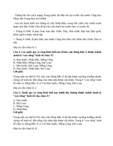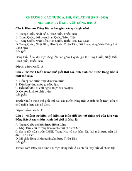 ề Tiên, Đài Loan, vùng Vi n ễ Đông Liên Bang Nga L i ờ giải: Đông B c ắ Á là khu v c ự r ng ộ l n ớ bao g m ồ 4 qu c ố gia là Trung Qu c, ố Nh t ậ B n, ả Hàn Quốc, Tri u ề Tiên Đáp án c n ch ầ n l ọ à: A Câu 2: Trư c ớ Chi n ế tranh thế gi i