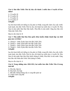 ệ Trong 4 “con rồng” kinh t châu ế Á, Đông B c ắ Á có 3 là Hàn Qu c, H ố ng C ồ ông, Đài Loan. Đáp án c n ch ầ n l ọ à: D Câu 6: Bán đ o ả Tri u ề Tiên bị chia c t ắ thành 2 mi n ề theo vĩ tuy n ế số bao nhiêu? A. Vĩ tuy n 39 ế B. Vĩ tuy n 38 ế C. Vĩ tuy n 16 ế D. Vĩ tuy n 37 ế L i ờ giải: Sau khi thoát kh i ỏ ách th ng ố tr ịc a ủ phát xít Nh t ậ , trong b i ố c nh ả c a ủ cu c ộ chi n ế tranh l nh, ạ bán đ o ả Tri u ề Tiên bị chia c t ắ thành hai mi n ề theo vĩ tuy n ế 38. Phía Nam là nhà nư c ớ Đ i ạ Hàn Dân Qu c. ố Phía B c ắ là nhà nư c ớ C ng ộ hòa Dân chủ Nhân dân Tri u ề Tiên Đáp án c n ch ầ n l ọ à: B Câu 7: Nhà nư c ớ Đ i ạ Hàn Dân qu c ố (Hàn Qu c) ố đư c ợ thành l p ậ vào th i ờ gian nào và đâu? ở A. Tháng 8 - 1948, phí ở a Nam bán đ o ả Tri u ề Tiên. B. Tháng 9 - 1948, phí ở a B c bán ắ đ o ả Tri u ề Tiên. C. Tháng 8 - 1949, phí ở a Nam bán đ o ả Tri u ề Tiên. D. Tháng 9 - 1949, phí ở a B c ắ bán đ o ả Tri u ề Tiên. L i ờ giải: Sau khi thoát kh i ỏ ách th ng ố tr ịc a ủ phát xít Nh t ậ , trong b i ố c nh ả c a ủ cu c ộ chi n ế tranh l nh, ạ bán đ o ả Tri u ề Tiên bị chia c t ắ thành hai mi n ề theo vĩ tuy n ế 38. Phía Nam là nhà nư c ớ Đ i ạ Hàn Dân Qu c ố (tháng 8-1948). Phía B c ắ là nhà nư c ớ C ng ộ hòa Dân ch N ủ hân dân Tri u ề Tiên (tháng 9-1948). Đáp án c n ch ầ n l ọ à: A Câu 8: Trong nh ng