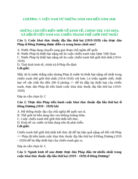 CHƯ N Ơ G 7: VI T Ệ NAM TỪ NH N Ữ G NĂM 1919 Đ N Ế NĂM 1930 NH N Ữ G CHUY N Ể BI N Ế M I Ớ V K Ề INH T , C Ế HÍNH TR , Ị VĂN HÓA, XÃ H I Ộ Ở VI T Ệ NAM SAU CHI N Ế TRANH TH G Ế I I Ớ TH N Ứ H T Ấ Câu 1: Cu c ộ khai thác thu c ộ đ a ị l n