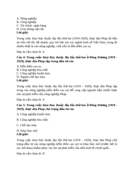 ầ thứ hai (1919 – 1929), th c ự dân Pháp t p ậ trung vào nông nghi p ệ (đ n ồ đi n ề cao su) để cung c p ấ nguyên li u ệ chi n ế lư c ợ cho s phát ự tri n c ể a công nghi ủ ệp Pháp. Đáp án c n ch ầ n l ọ à: A Câu 5: Trong cu c ộ khai thác thu c ộ đ a ị l n