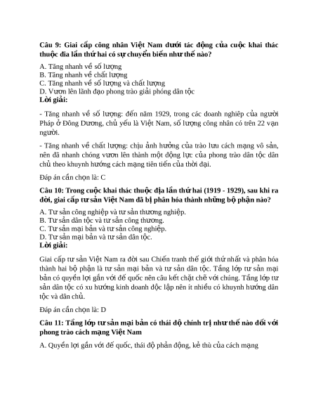 ủ chính sách khai thác thu c ộ đ a, ị xã h i ộ Vi t ệ Nam có sự chuy n ể bi n m ế i ớ v i ớ sự ra đ i ờ c a hai ủ giai c p l ấ à t s ư n và t ả i u t ể s ư n. ả Đáp án c n ch ầ n l ọ à: B Câu 9: Giai c p ấ công nhân Vi t ệ Nam dư i ớ tác đ ng ộ c a ủ cu c ộ khai thác thu c đi ộ a l n t ầ h h