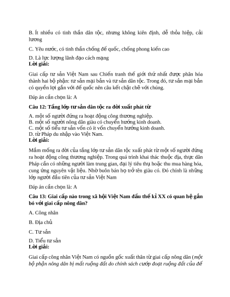 ứ hai (1919 - 1929), sau khi ra đ i ờ , giai c p t ấ s ư n ả Vi t ệ Nam đã b phâ ị n hóa thành nh ng b ữ ph ộ n nào? ậ A. T s ư n ả công nghi p và t ệ s ư n t ả hư ng nghi ơ p. ệ B. T s ư n dân ả t c và t ộ s ư n công t ả hư ng. ơ C. T s ư n m ả i ạ b n và t ả ư s n ả công nghi p. ệ D. T s ư n ả m i ạ b n ả và t s ư n dân t ả c. ộ L i ờ giải: Giai c p ấ tư s n ả Vi t ệ Nam ra đ i ờ sau Chi n ế tranh th ế gi i ớ th ứ nh t ấ và phân hóa thành hai bộ ph n ậ là tư s n ả m i ạ b n ả và tư s n ả dân t c. ộ T ng ầ l p ớ tư s n ả m i ạ b n ả có quy n ề l i ợ g n ắ v i ớ đ ế qu c ố nên câu k t ế ch t ặ ch ẽ v i ớ chúng. T ng ầ l p ớ tư s n ả dân t c ộ có xu hư ng ớ kinh doanh đ c ộ l p ậ nên ít nhi u ề có khuynh hư ng ớ dân t c ộ và dân ch . ủ Đáp án c n ch ầ n l ọ à: D Câu 11: T ng ầ l p ớ tư s n ả m i ạ b n ả có thái đ ộ chính tr ị nh ư th ế nào đ i ố v i ớ phong trào cách m ng ạ Vi t ệ Nam A. Quy n ề l i ợ g n v ắ i ớ đ qu ế c, t ố hái đ ph ộ n đ ả ng, k ộ t ẻ hù c a ủ cách m ng ạ