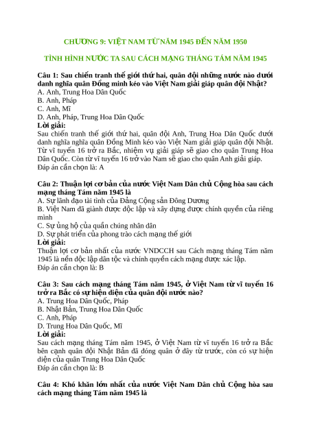 ả giáp sẽ giao cho quân Trung Hoa Dân Quốc. Còn t vĩ ừ tuy n 16 t ế r vào N ở am s gi ẽ ao cho quân Anh gi i ả giáp. Đáp án c n ch ầ n l ọ à: A Câu 2: Thuận l i ợ cơ b n c ả a ủ nư c ớ Vi t ệ Nam Dân ch ủ C ng hòa ộ sau cách m ng t ạ